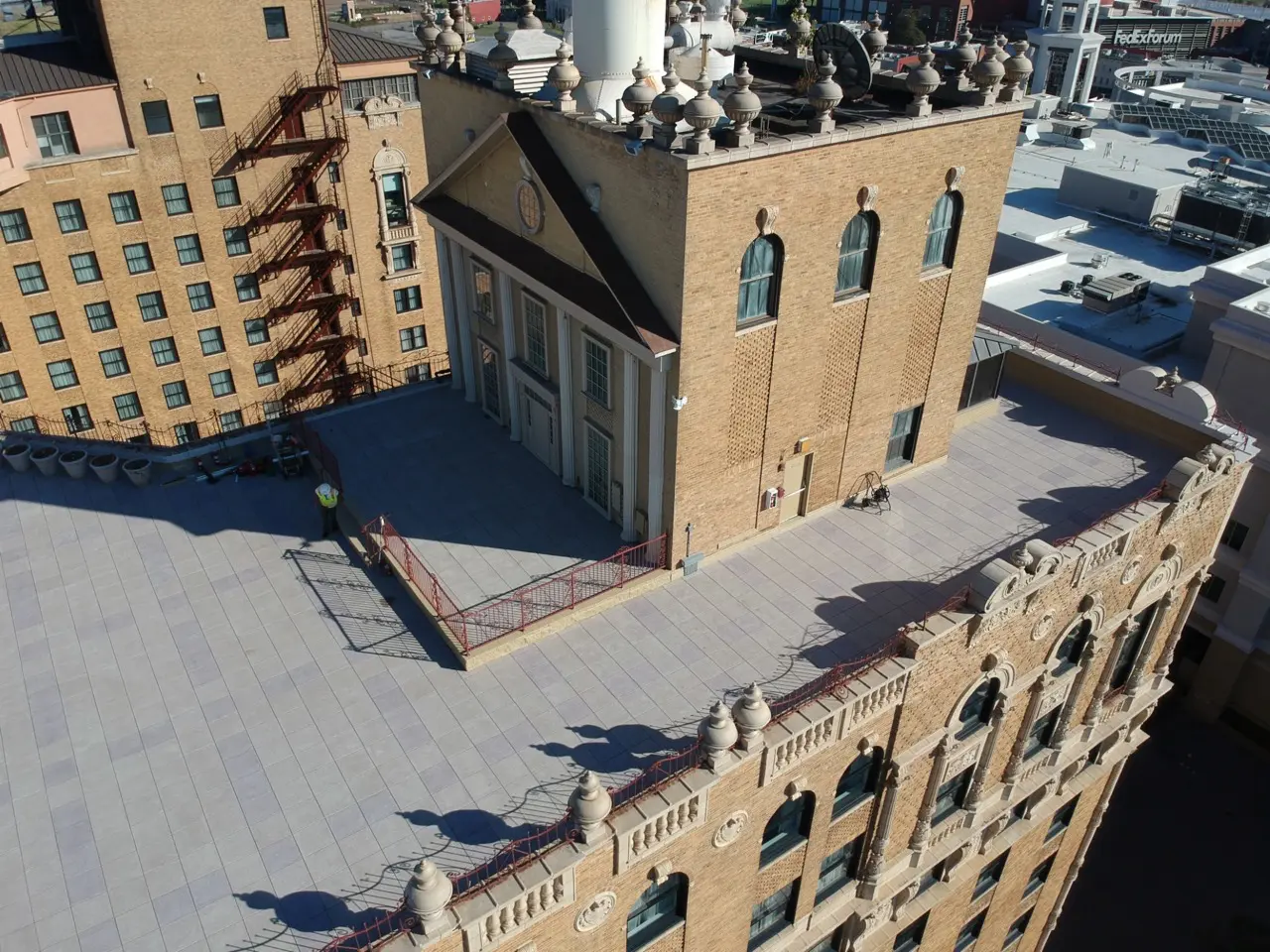 The project at the Peabody Historic Hotel required precise planning and coordination to maintain the aesthetic and historical integrity of this Memphis, TN landmark. Our team installed high-performance pedestal pavers to create a functional, visually striking terrace space that enhances both the guest experience and the iconic Peabody atmosphere.